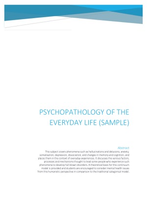 Document outlines each week and combines lectures, tutorial and Key Aspects of Readings. Key terms are presented in blue boxes and DSM criteria for each mentioned mental disorder. Key Ideas are presented in Smart Art. Summaries which short answer questions can be derived from for each week have been constructed at the end of the document. ****NOTE page numbers in contents are not correct and show errors as pages were removed for sample purpose, TRUE CONTENTS VARIES*****