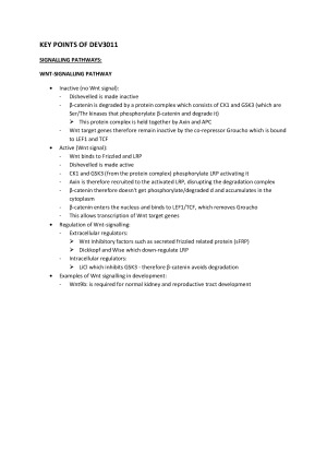 This document contains comprehensive exam notes covering all major topics from DEV3011. It's easy to follow, informative and summarises the unit well. Major topics covered include: - Signalling pathways - Anterior-posterior, Left-Right, Dorsal-Ventral patterning - Axes of limb development - Hox genes - Regeneration - Epigenetic regulation - Strengths and weaknesses of model organisms - Experimental techniques - Blood vessel formation - Micro RNAs