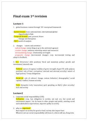Entire course summarised from the lectures, tutorials and the textbook. They are all substantial knowledge and should be remembered for the final exam. Additional notes for analysing a chosen company-Tesla.