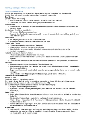 Detailed PSYCHOL 3026notes which accompany the lectures - textbook references are not included as there are two textbooks which can be used for the course (Bouton or Mazur - Learning and Behaviour [the same title]) and it depends on each person's preference of textbook. Please note that the course does not have 24 lectures - some were dedicated to practical briefings and the last two lectures were dedicated to online revision. (lecture 15 appears missing, but it was just a typo, sorry!)