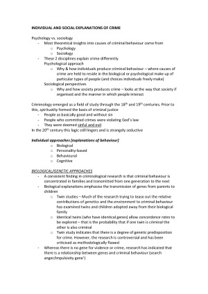 Summaries of all explanations of crime covered in lecture content - including individual, early social, and contemporary social explanations. Covers about 3 weeks of lecture content from CRIM1101 - Crime & Criminology.