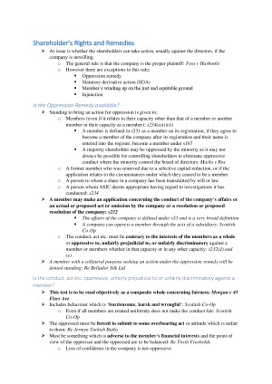 Contains detailed LAWS2203 notes on cases and commentary on legislation covering areas such as: - Corporate contracting - The constitution of the company - Expropriation of rights attaching to shares (Gambotto) oppression remedy - Variation of class rights - Buybacks and capital reductions - Dividends - Shareholders rights - Winding up remedy - Directors duties - Insolvent trading - Voluntary administration - Receivership and more.