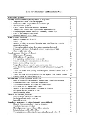 These are my complete summaries that cover ALL of the 70114 - Criminal Law & Procedure content. The first half, which is indexed, are the summaries I used for the exam, which is usually only from week 6 onwards. These notes helped me achieve 87% overall, and 38/40 in the exam, so clearly worth it! The notes are indexed, organised under topics and extensive - there is nothing they don't cover! There are page numbers which correlate to the required textbook. The second half is the rest of my notes used for the assignment in the first 6 weeks. They may not be relevant for the exam, but will definitely help you understand the concept of murder particularly for the assignment. :)