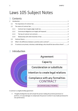 Comprehensive subject notes for LAWS105 contract law. Easy to navigate with table of contents and headings.