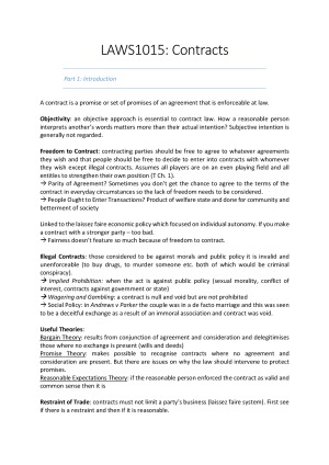 A very thorough set of notes for LAWS1015 summarising both the casebook and textbook with special attention on the most important aspects of all core and noteworthy cases for this course. The notes follow the structure of the unit outline (see sample). The final two parts are especially in-depth because the final exam will (likely) be based on content drawn from these areas ('terms and parties' and 'breach and frustration').