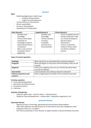 My personal exam notes covering all topics from this unit in simple, easy to understand terms. These notes will be useful in completing your etests as well as the final exam. Topics covered include: Why Research? (types of research questions, types of research, forming a reserach question using PICO) Systematic Reviews (characteristics, hierarchy, process) Methodology (non randomised studies, randomised studies, determining differences between groups) Data Collection (qualitiative, quantitatie, validity) Testing Hypotheses (definitions, null hypothesis, statistical power, variance, effect size)Non-Experimental Studies (value, types, prevalance, incidence and relative risk) Converting Raw Scores (definitions- z scores, percentiles, confidence intervals) Measurement Error (including systematic and random error) Outcome Measures (validity, reliability and clinical utility) Qualitative Research (aim, characteristics, data collection) Naturalistic Inquiry (grounded theory, participatory action research, phenomenology, ethnography) Q Methodology (definition, steps involved, advantages and disadvantages) Management and Analysis of Qualitative Data (management steps, analysis, trustworthiness) Ethics in Research (Decleration of Helsinki, informed consent) Evidence Based Practice (process, barriers and strategies)