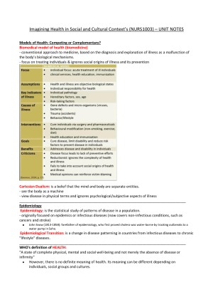 Imagining Health in Social and Cultural Context (NURS1003)- UNIT NOTES
